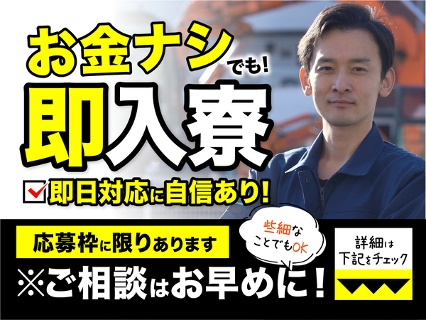 | 待遇・福利厚生 | ・日払いあり ・週払いあり ・前払いあり ・生活支援アリ ・完全個室寮完備 ・赴任旅費支給 ・通勤交通費支給 ・各種保険完備 ・残業手当 ・深夜手当 ・休出手当 ・皆勤手当 ・履歴書不要 ・電話・WEB面接可能 ※各待遇に規定アリ ご相談、ご質問のみでもOK! お気軽にお問い合わせくださいね! |